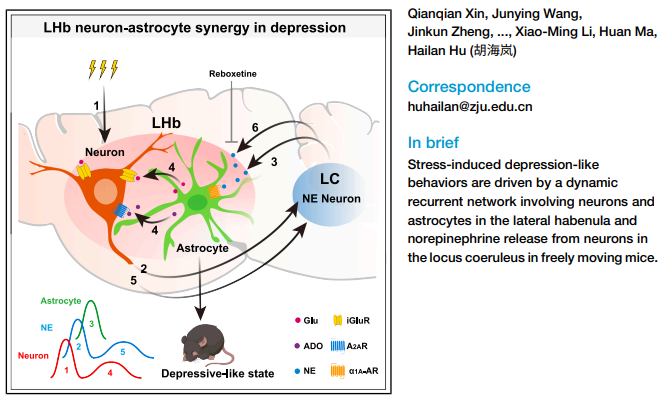 2025年,团队在《Cell》上再添新成果,第一次说清楚了外侧缰核(LHb)里,神经元和星形胶质细胞在抑郁发生时,是怎么“互相影响”的。研究发现,压力会让LHb里的星形胶质细胞“兴奋”(钙离子浓度升高),也会让神经元产生“双向反应”,而这一切,都依赖于LHb和蓝斑核(LC)之间的“循环神经网络”。星形胶质细胞会通过“胶质递质”,激活神经元、促进去甲肾上腺素释放,进而让抑郁样行为加重。这也给抑郁症的预防和干预,提供了新的思路。