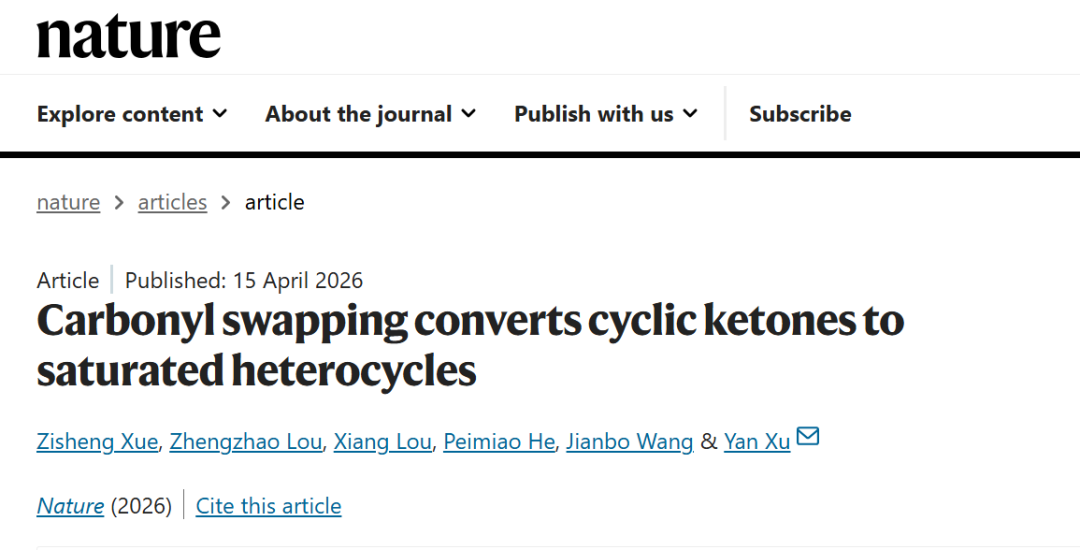 4月15日,北京大学许言研究员团队在《自然》(Nature)上发表了题为“Carbonyl swapping converts cyclic ketones to saturated heterocycles”的论文。该文提出了一种全新的分子转化策略“羰基交换”,将廉价易得的环酮转化为N/O/S/Se/Te等各类饱和杂环。