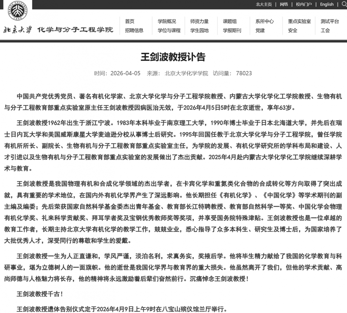 据北京大学4月5日讣告:著名有机化学家、北京大学化学与分子工程学院教授、内蒙古大学化学化工学院教授、生物有机与分子工程教育部重点实验室原主任王剑波教授因病医治无效,于2026年4月5日5时在北京逝世,享年63岁。