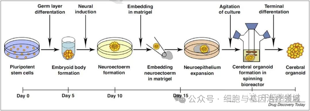 上皮类器官培养基是以附加与器官相关的生长因子的培养基为基础的。因此,从其他组织(如呼吸道、肝脏、胰腺、皮肤、膀胱、大脑、心脏)提取的细胞器要求在培养中补充相关生长因子。例如大脑类器官培养过程如下图:诱导多能干细胞(iPSC)衍生细胞在神经诱导介质中生长,产生神经外胚层,嵌入Matrigel中,并在旋转生物反应器或轨道摇床中生长,以更好地扩散,获得三维脑器官。在暴露于维甲酸的情况下,大脑器官通过自我组装模式,形成自缔和组织,形成包括放射状胶质细胞在内的不同种群的神经祖细胞,这些神经祖细胞扩展形成大脑结构。