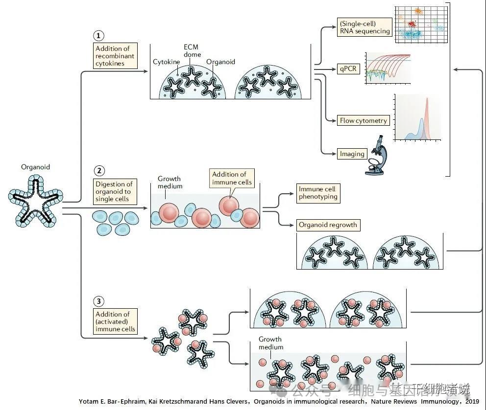3.在ECM或生长培养基(悬浮培养)中,向完整的类器官中添加(活化的)免疫细胞,如T细胞或固有淋巴样细胞(ILCs),以评估免疫细胞与上皮细胞之间的相互作用。这些检测的读数通常包含消化形成的器官和随后的转录。单细胞RNA测序或定量PCR(QPCR),成像和/或流式细胞术评估上皮细胞和/或免疫细胞表型。在这些共培养中使用的免疫细胞要么直接从小鼠组织(例如,脾细胞、肠上皮内淋巴细胞、固有层T细胞、固有层ILCs或肺ILC2s)中分类,要么直接从人外周血中提取,要么先在体外分化。