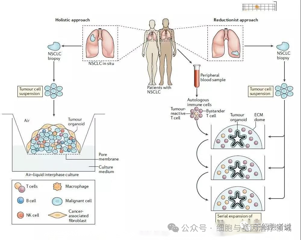 在整体方法(左)中,肿瘤活检组织是在气液界面间环境培养,所有肿瘤细胞类型的细胞悬液,包括内源性免疫细胞和其他非上皮细胞类型,促进肿瘤特异性T细胞的生长。