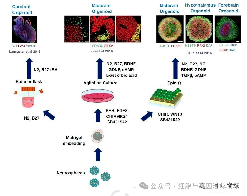 3.2 特定神经类器官培养及药物筛选等应用首先神经球在不同分化培养基种培养(具体的诱导因子及生长因子见下图),产生大脑,中脑,海马,前脑等不同脑部类器官。