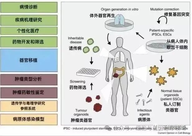 通过类器官繁殖的干细胞群取代受损或者患病的组织,类器官提供自体和同种异体细胞疗法的可行性,未来这一技术在再生医学领域也拥有巨大的潜力。使用这项技术,采用CRISPR/Cas9能够纠正体外遗传异常并能够将健康的转基因细胞再次回输入患者体内,并在后期整合入组织内。在精准医学应用中,患者衍生的类器官也被证明为有价值的诊断工具。在进行治疗之前,采用从患者样本来源的类器官筛查患者体外药物反应,旨在为癌症和囊胞性纤维症患者的护理提供指导并预测治疗结果。随着类器官培养系统以及其实验开发技术的不断发展,类器官应用到了各大研究领域。