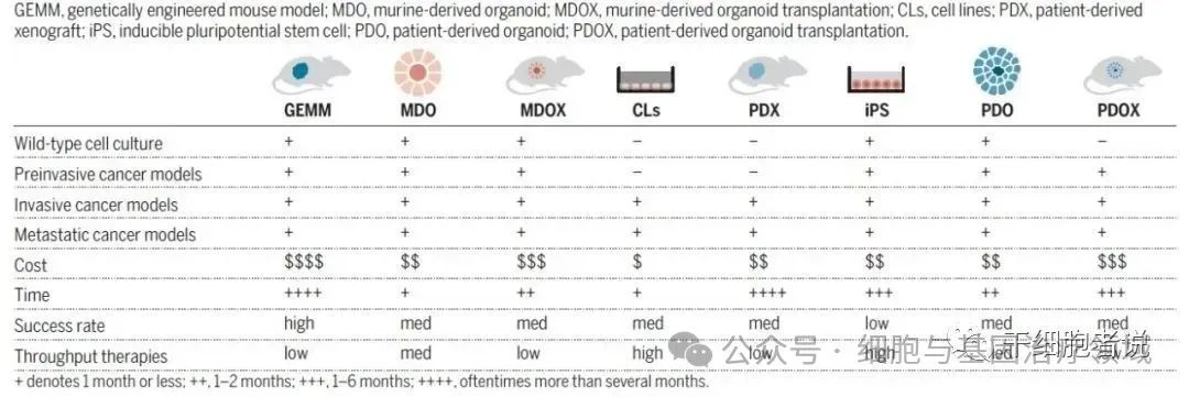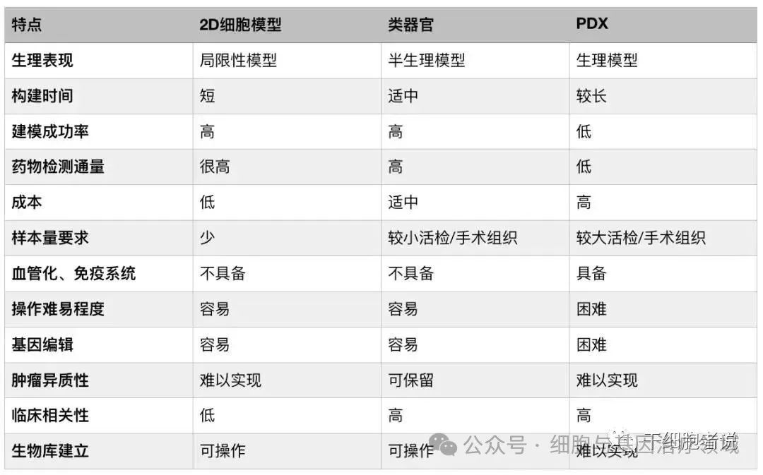 目前,类器官多用于肿瘤癌症的研究中。观察下图中临床前肿瘤癌症模型的比较,可以发现类器官有着很强的优势: