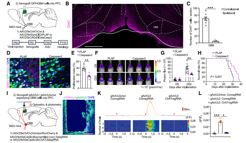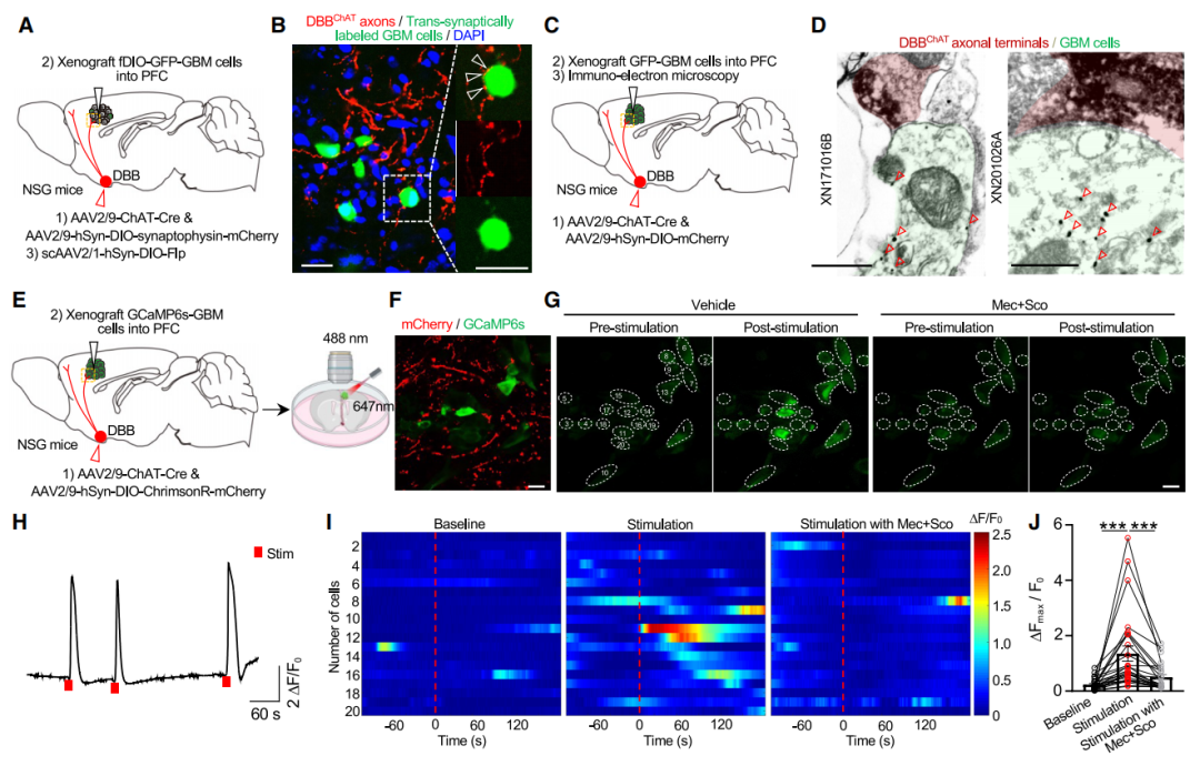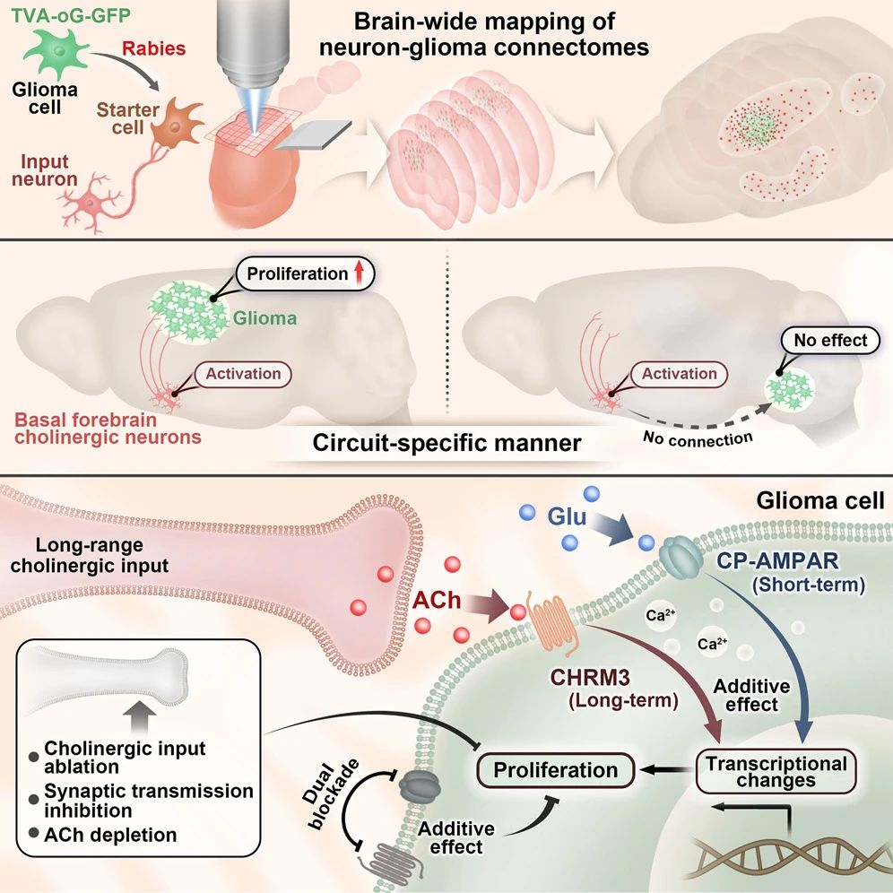 此前研究多聚焦于谷氨酸能信号在肿瘤进展中的作用,但对于其他神经递质系统(如胆碱能系统)如何参与调控GBM,尤其是长程神经输入的作用,仍知之甚少。