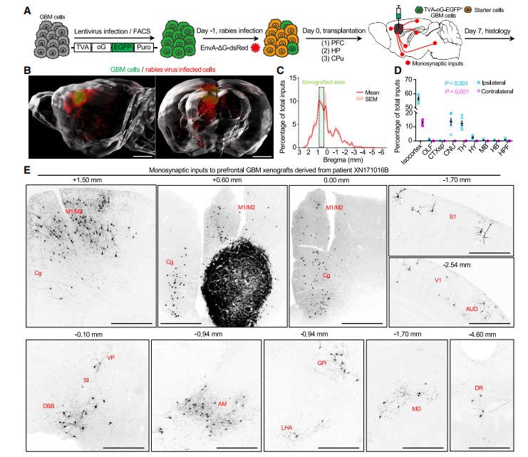 研究团队采用单突触狂犬病病毒追踪技术,在全脑范围内系统性地绘制了人源GBM移植瘤的神经输入图谱,揭示了其与局部及远距离神经元的连接模式。