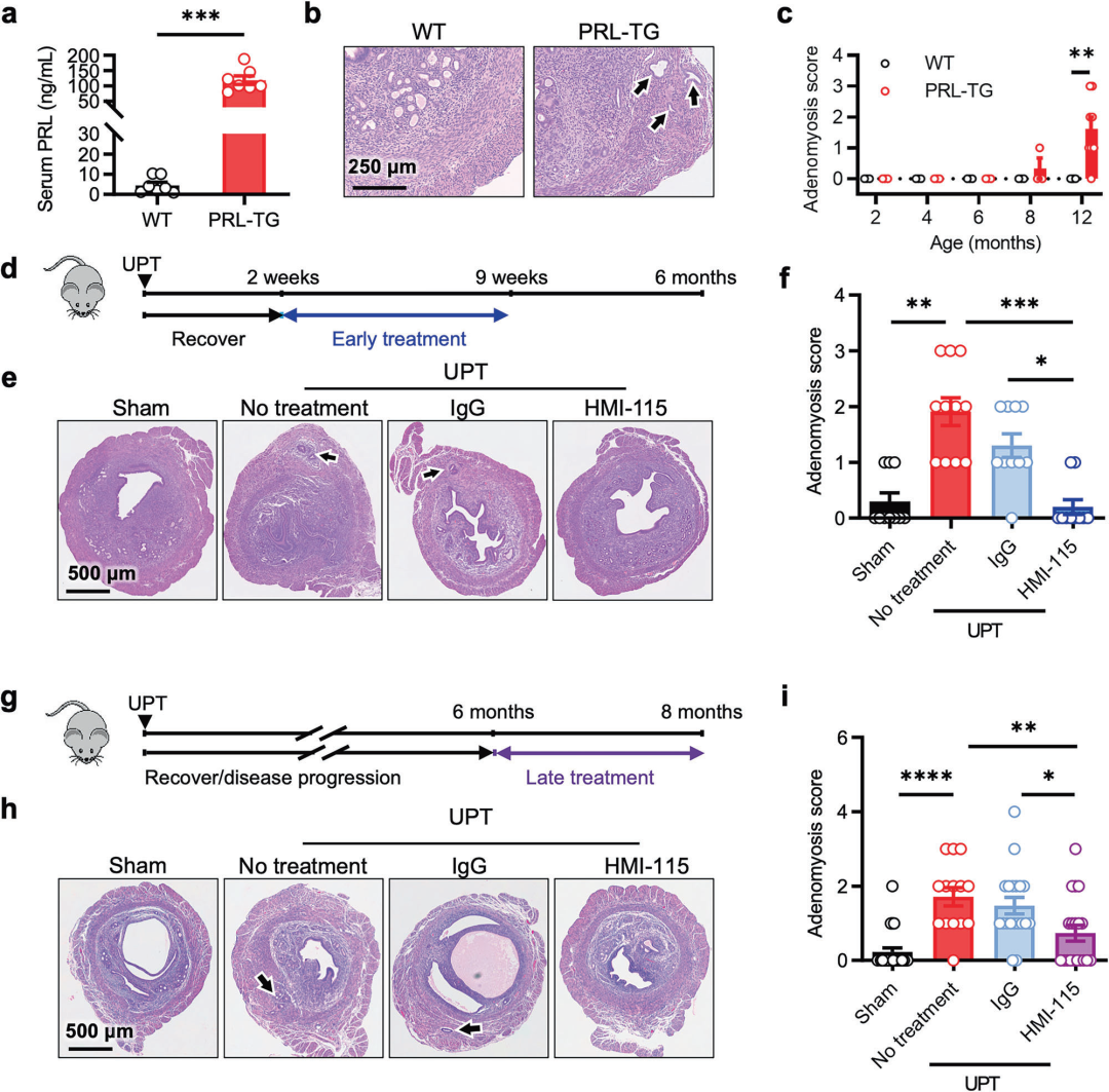 早期治疗:术后 2 周(无明显病理改变时),每周注射 30mg/kg HMI-115(或对照 IgG),持续 7 周,结果显示 HMI-115 显著降低腺肌病发生率与严重程度。