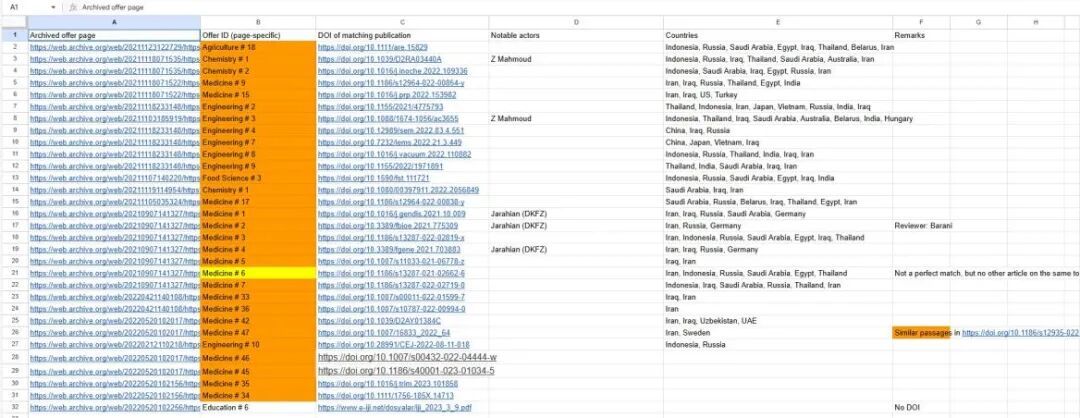 一份在线的文档列表详细记录了与这个论文工厂网站广告相匹配的已发表论文,其中就包含了数篇穆斯塔法尚未被撤稿的论文。