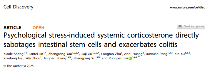 2025 年,浙江大学医学院附属邵逸夫医院白荣盘团队在Cell Discovery《细胞发现》(影响因子 12.8)发表的研究,为该问题提供答案并给出研究范式。其以“Psychological stress-induced systemic corticosterone directly sabotages intestinal stem cells and exacerbates colitis” 《心理应激诱导的全身性皮质酮直接损伤肠道干细胞并加重结肠炎》为题,遵循“机制到疾病” 逻辑,通过转录组测序、免疫荧光染色、肠道类器官培养、小鼠应激及结肠炎模型等实验,揭示心理应激影响肠道健康的 “应激信号 - 效应分子 - 靶细胞” 新通路,成为肠 - 脑轴机制研究的创新突破口。