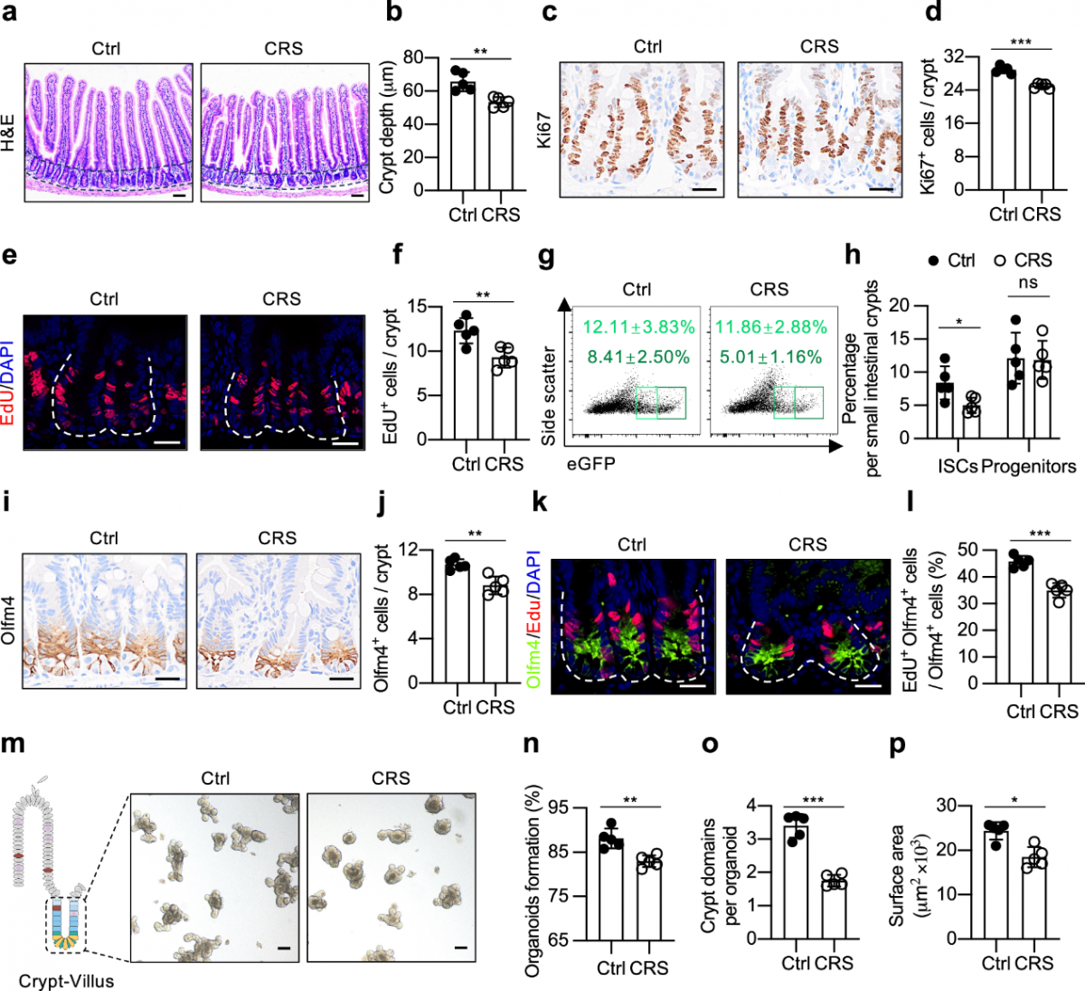 利用 Lgr5-EGFP 报告鼠进一步研究发现:流式与免疫荧光染色均显示,CRS 使肠道 Lgr5⁺肠干细胞数量下降约 1.5 倍,其下游 EGFPlow 祖细胞比例无明显变化(图 1g–h);Olfm4 染色不仅验证了 Lgr5⁺干细胞数量减少,还发现其增殖活性显著受抑(图 1i–l)。