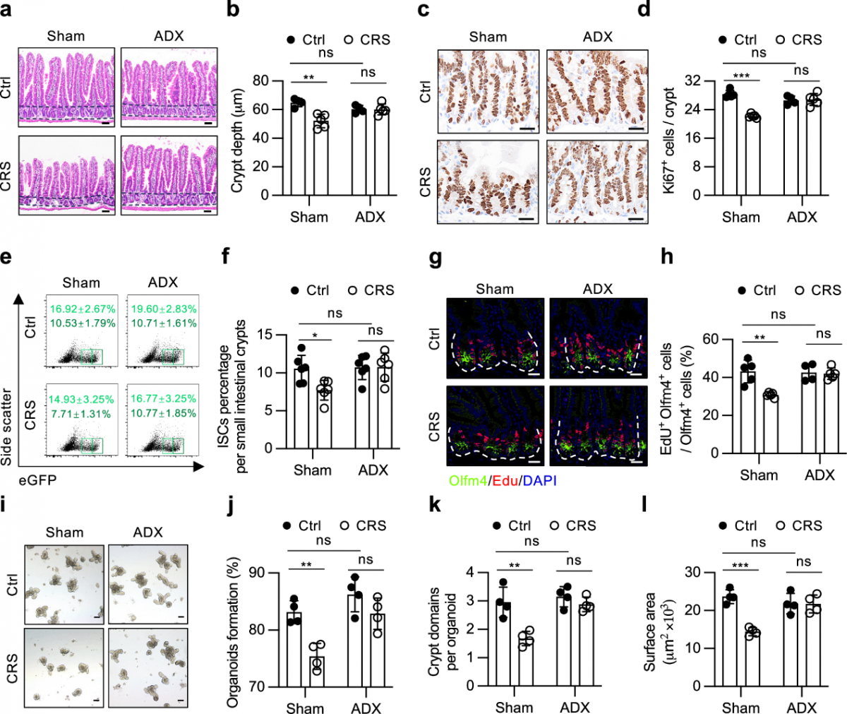 在 Lgr5-EGFP 报告鼠中,流式检测发现,CRS 显著降低的 Lgr5⁺肠道干细胞(ISCs)比例,在 ADX 组中得以恢复(图 2e–f);进一步联合 EdU 与 Ki-67 染色分析表明,ADX 还能使应激状态下 ISCs 的增殖活性恢复至非应激组水平(图 2g–h)。此外,类器官培养实验显示,ADX 也可显著恢复 CRS 抑制的小肠隐窝再生能力(图 2i–l)。