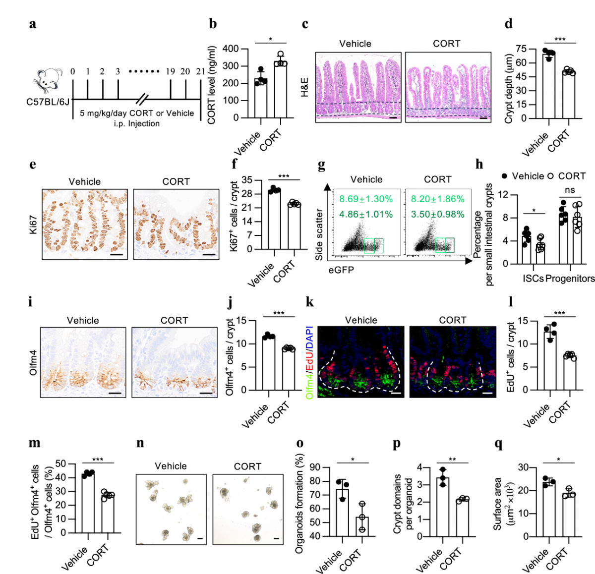 体外类器官培养实验进一步证实:皮质酮处理会导致类器官形成效率下降,且类器官体积变小、出芽数减少(图 3n–q)。
