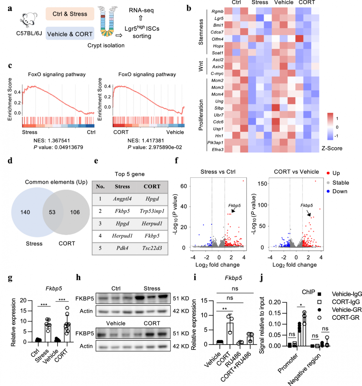 FoxO 信号通路在调控细胞周期、增殖等生理过程中至关重要。为挖掘其上游调控因素,研究者对慢性束缚应激(CRS)与皮质酮处理组的差异表达基因进行交集分析,发现两组共有 53 个基因上调、11 个基因下调(图 5d)。其中 Fkbp5 显著上调,且已知其可正向调控 FoxO 通路(图 5e–f);独立样本实验进一步证实,应激或皮质酮处理小鼠的小肠及结肠隐窝中,Fkbp5 表达均明显升高(图 5g–h)。