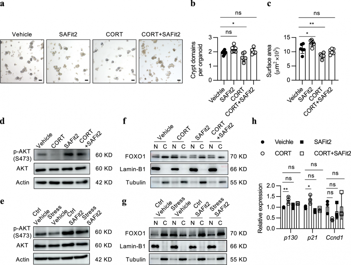 已有研究表明,FKBP5 可通过结构域与 AKT、PHLPP 形成复合物,增强 PHLPP 介导的 AKT 去磷酸化,进而促进 FOXO1 去磷酸化并核转位,抑制细胞周期。本研究免疫印迹结果显示,皮质酮或应激处理显著降低小肠及结肠隐窝中 p-AKT(S473)水平,而 SAFit2 可恢复 AKT 活性、减少 FOXO1 核转位(图 6d–g),从而下调细胞周期抑制因子 p130 与 p21 的表达(图 6h)。