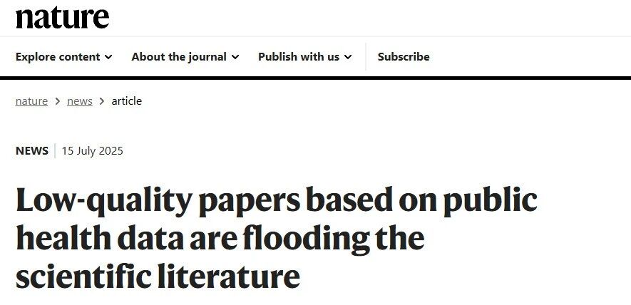 Nature 也在近期的报道中指出,除了NHANES,其他生物医学数据库(UK Biobank、FAERS、GBD和FinnGen)也频繁被这些低质论文利用。