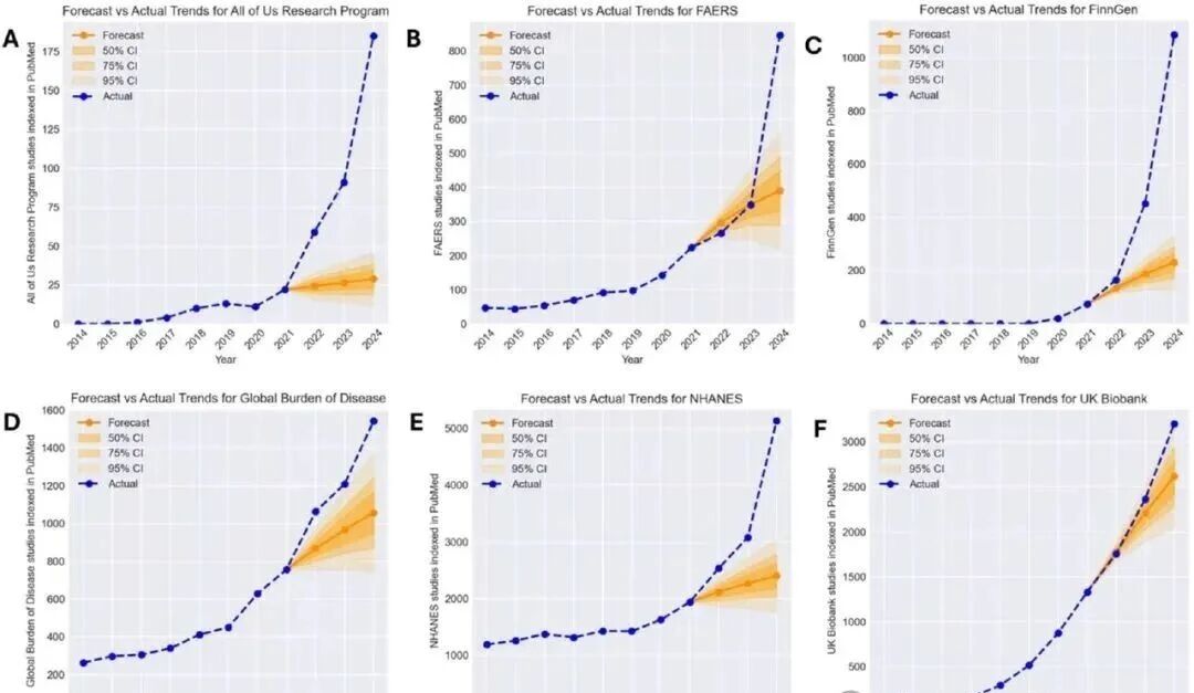 根据Matt Spick、Anthony Onoja等人的研究,2021年-2025年间,有六个数据集的论文数量远超预期增长,其中NHANES、UK Biobank、FAERS、GBD和FinnGen这五个数据源的“模板化”论文爆发式增长。