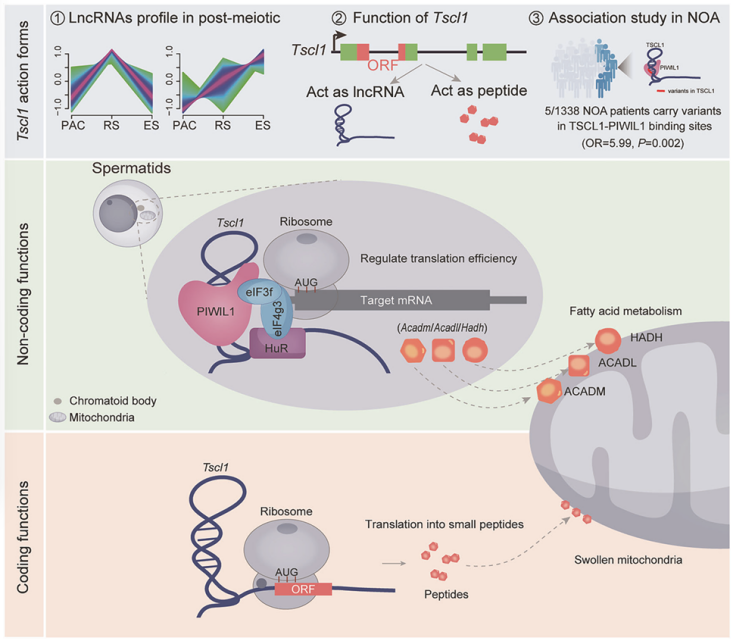 核心亮点:长链非编码RNA(lncRNA)在哺乳动物生理过程中作用关键,但在精子发生中的功能仍未被充分挖掘。胡志斌 / 顾亚云团队首次发现男性特异性保守lncRNA TSCL1在男性不育中扮演 “双面” 调控角色:一方面,TSCL1可通过与PIWIL1和HuR蛋白形成复合物,精准调控精子发生相关靶mRNA的翻译过程;另一方面,其还能编码53个氨基酸的小肽,该小肽可维持精子线粒体鞘结构稳定,保障精子运动能力。动物实验证实,TSCL1敲除小鼠会出现雄性不育,表现为精子活力显著下降、线粒体鞘结构紊乱。更重要的是,团队发现人类TSCL1与PIWIL1结合区域的罕见变异,会显著增加非梗阻性无精子症的发病风险。该研究首次将lncRNA–蛋白互作缺陷纳入男性不育的核心病因,不仅拓展了对lncRNA多功能性的认知,更为非梗阻性无精子症的精准诊断与靶向治疗提供了全新分子靶点。