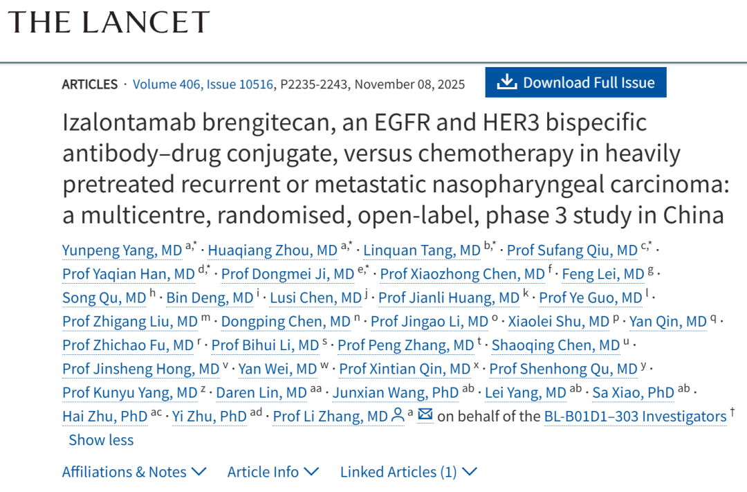 2025年10月19日,中山大学张力团队在Lancet(IF=88.5)在线发表题为“Izalontamab brengitecan, an EGFR and HER3 bispecific antibody–drug conjugate, versus chemotherapy in heavily pretreated recurrent or metastatic nasopharyngeal carcinoma: a multicentre, randomised, open-label, phase 3 study in China”的研究论文,该研究报告了伦康依隆妥单抗(Izalontamab brengitecan,Iza-bren),一种EGFR和HER3双特异性抗体-药物偶联物,与化疗在重度预处理复发或转移性鼻咽癌中的3期临床试验结果。研究结果表明,与化疗相比,Iza-bren显著改善了重度预处理复发或转移性鼻咽癌患者的ORR,具有可控制的安全性。