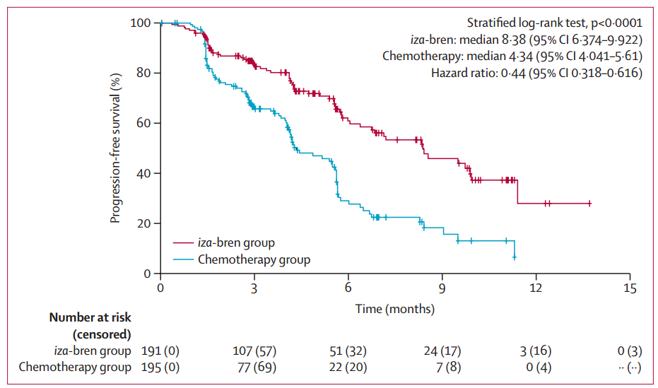 抗体-药物偶联物(ADC)是一种很有前景的治疗类别,目前正在不同癌症中进行研究。表皮生长因子受体(EGFR)在高达85%的鼻咽癌肿瘤中过度表达,并与较差的预后相关。Izalontamab brengitecan(iza-bren;也称为BL-B01D1)是第一种靶向EGFR和人表皮生长因子受体3 (HER3)的双特异性ADC,偶联到一种新的拓扑异构酶I抑制剂(Ed-04)有效载荷,具有8.14的高药物抗体比。Iza-bren被设计为特异性结合肿瘤表面的EGFR或HER3,随后通过内吞作用内化。该过程最终导致溶酶体中Ed-04的释放,从而通过阻碍DNA复制和RNA合成诱导肿瘤细胞死亡。之前的一项1期研究显示,iza-bren在重度预处理复发或转移性鼻咽癌患者中具有令人鼓舞的抗肿瘤活性,观察到的客观缓解率(ORR)为59.5%(确认ORR为37.8%)。