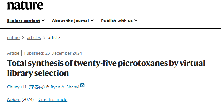 值得注意的是,在此之前,2024年,Scripps研究所Ryan A. Shenvi研究员以及李春雨携手在Nature 期刊上发表了题为“Total synthesis of twenty-five picrotoxanes by virtual library selection”的研究论文。