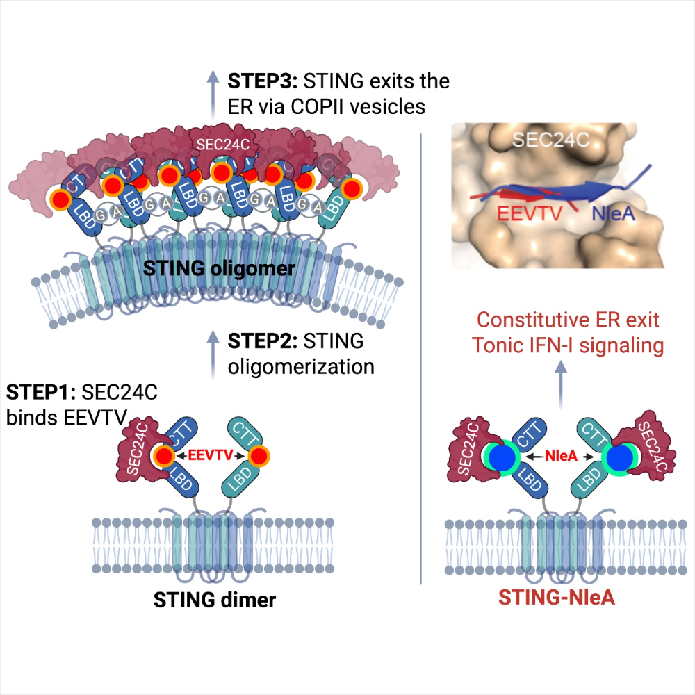 cGAS-STING信号通路在先天免疫、炎症、癌症及神经退行性疾病中发挥着重要作用。cGAS能够识别细胞内的双链DNA,并催化合成cGAMP;作为一种第二信使,cGAMP可激活STING。与cGAMP结合之后,STING便会发生寡聚化,并从内质网转运至高尔基体;这一转运过程是由COPII囊泡介导的。在高尔基体上,STING招募TBK1;TBK1随后对STING进行磷酸化修饰,进而招募IRF3并激活I型干扰素信号通路。STING内质网输出对于激活cGAS-STING信号通路的所有下游活动至关重要,然而,介导这一过程的分子机制目前尚不明确。