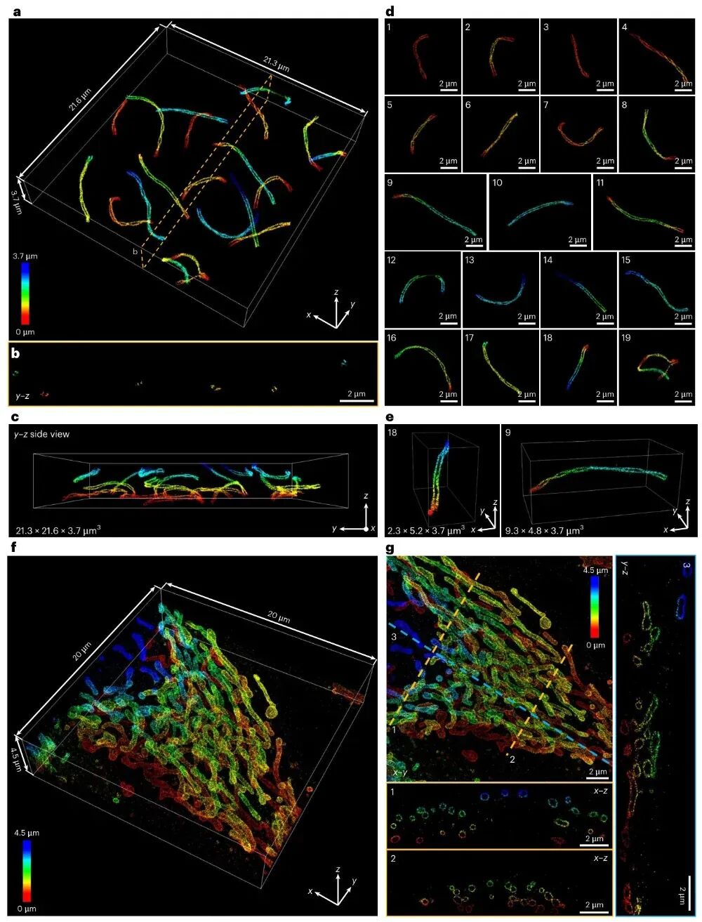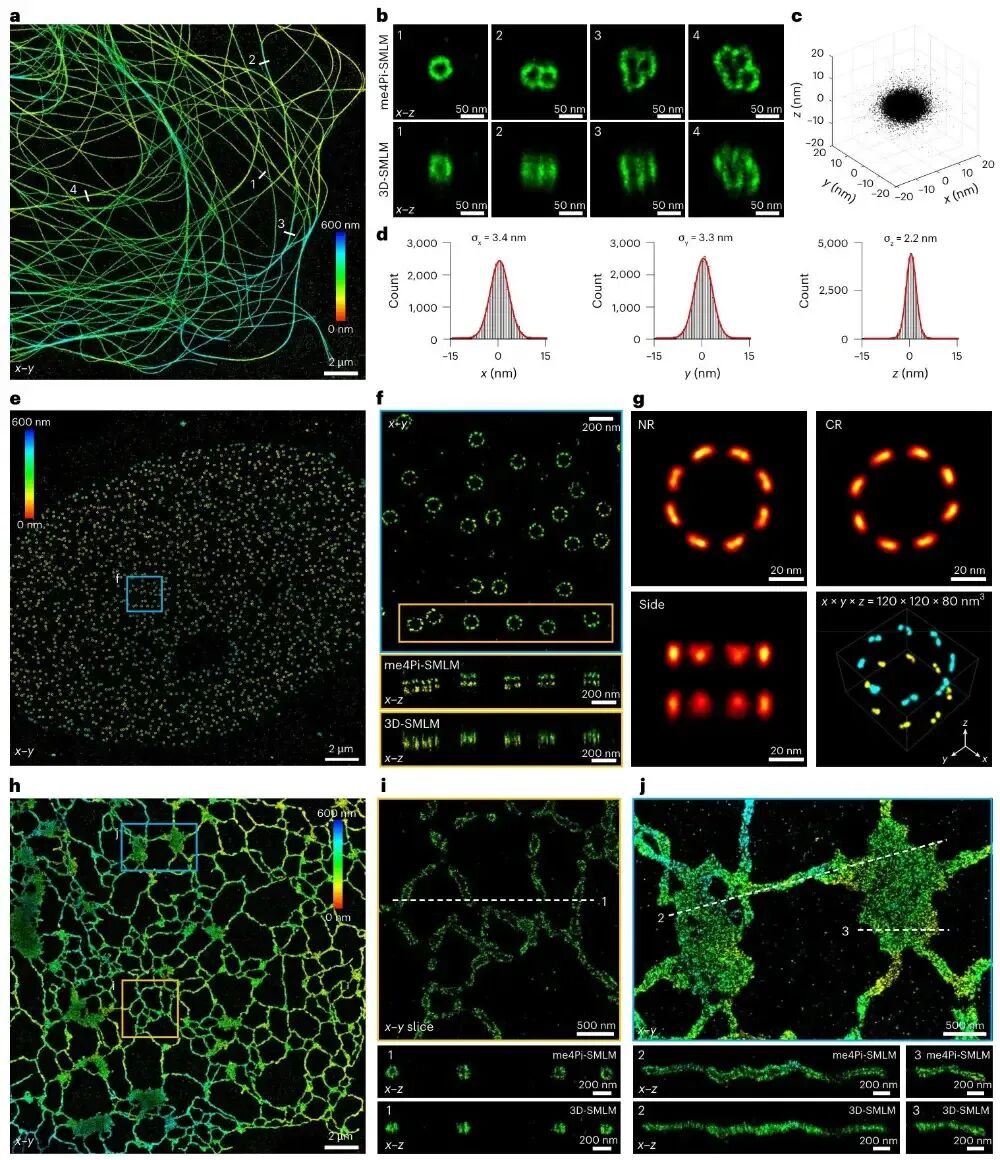 图4 me4PiSMLM的全细胞三维成像能力作者通过轴向层扫与图像拼接,成功对小鼠精母细胞联会复合体、HeLa细胞线粒体进行深度达数微米的全细胞三维重构,清晰呈现复杂超微结构的立体形态与空间分布,且在整个成像体积内保持稳定的高定位精度与分辨率,无明显伪影。