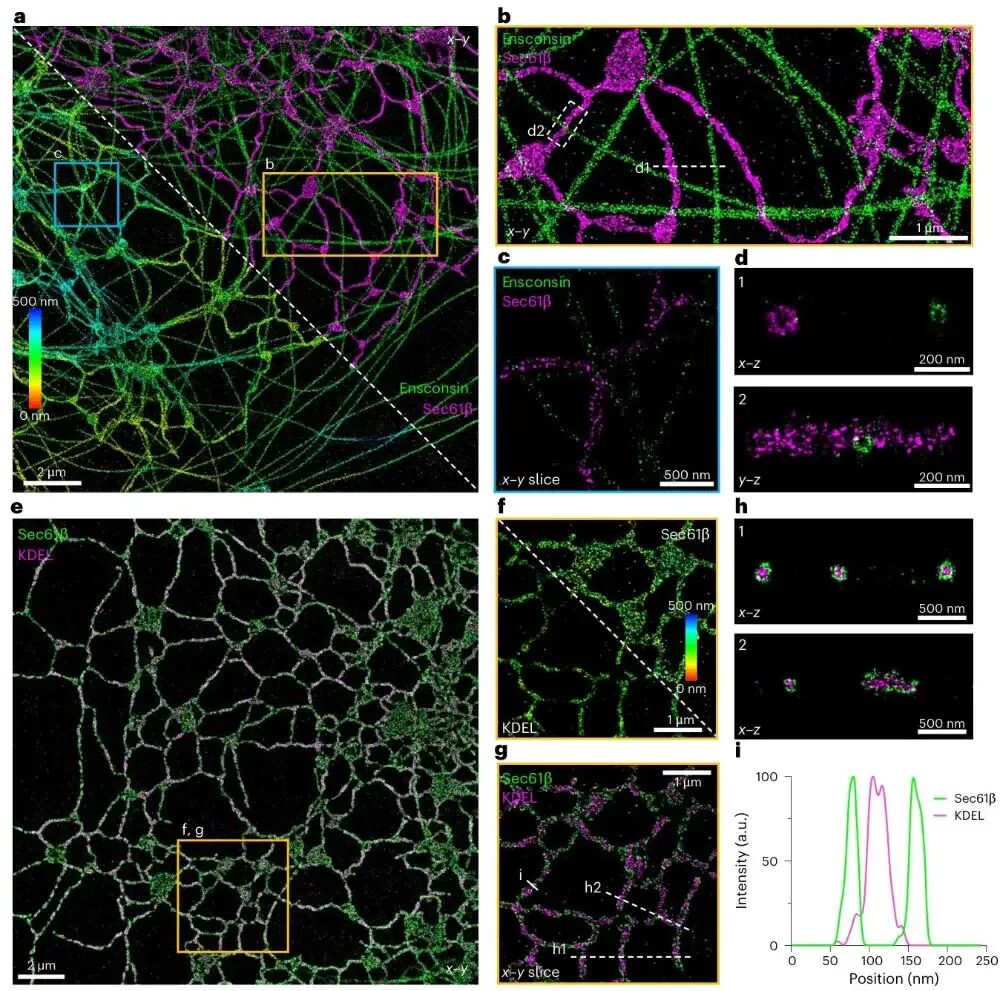 图3 me4PiSMLM的双色同步成像能力作者结合回收荧光技术实现两种荧光探针的高效光谱分离与低串扰成像,分别对细胞内微管与内质网、内质网膜与内腔进行双色标记成像,清晰呈现不同细胞器或结构间的空间位置关系与精细排布。