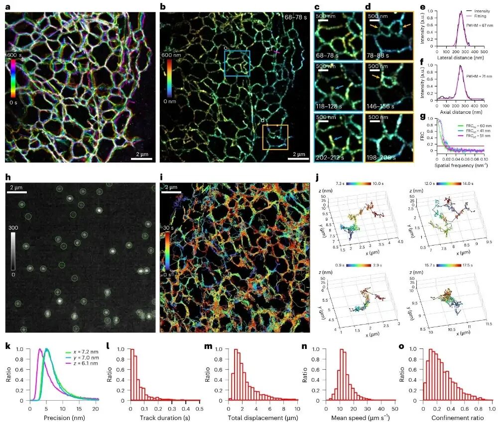 图5 me4PiSMLM在活细胞中的动态成像与单分子三维追踪me4Pi SMLM对活细胞内质网进行长时程三维超分辨观测,捕捉到内质网管状结构的生长、融合与消失等动态过程,同时完成单分子三维轨迹追踪与定量分析,获得6–7 nm的活细胞定位精度,填补了传统4PiSMLM难以用于活细胞成像的技术空白。