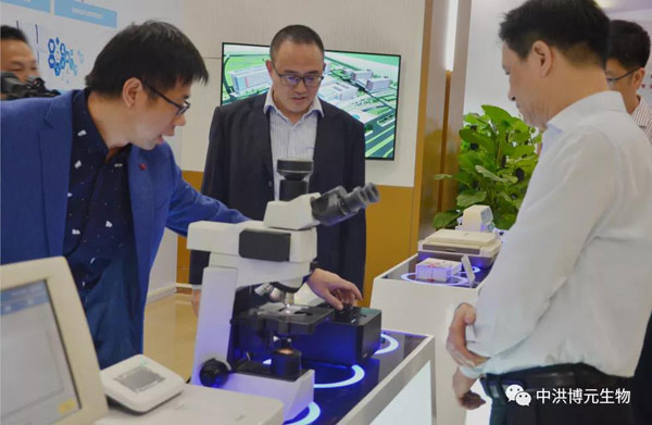 在中洪博元企业展位上,王主任一行认真聆听了中洪博元技术总监袁博对于科研实验仪器的详细介绍。本次中洪博元展示的部分仪器有nanophotometer np80 超微量分光光度计,奥林巴斯CX41生物显微镜,BL-420S和半干转膜仪。