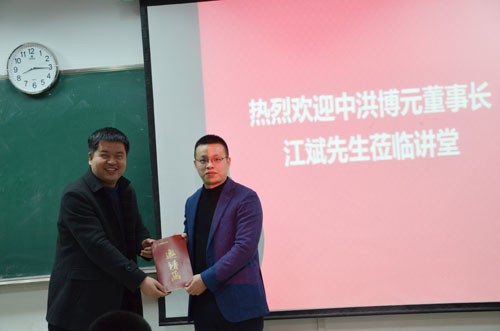 为进一步加强校企合作,2020年12月3日,江西财经大学蛟桥校区1305教室,灯光明亮,中洪博元公司董事长江斌先生应邀来校讲授管理之道,50余名双学位毕业班本科生聆听讲座。
