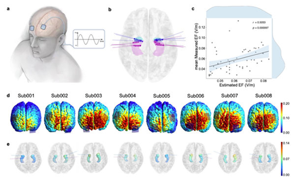 神经调控(脑刺激)技术可以通过不同类型物理场调节大脑内的电信号传递与加工过程,并产生持续效果,已成为临床精神疾病非药物治疗的主流方案。然而,无创电刺激对大脑深部区域的调控效果尚不清晰,是制约临床神经调控技术发展与精准化应用的重要瓶颈。研究团队通过构建无创电刺激结合同步采集颅内神经电生理信号的研究体系,解析了大脑深部区域对外界物理场的响应模式;计算了在前额叶皮层等区域施加无创交变电刺激(tACS)时的皮层电场仿真模型;揭示了大脑在接受传递外界物理场刺激过程中的特异性滤波模式。本研究首次证明无创电刺激可以精准调节大脑深部区域功能,为发展老年痴呆、抑郁症等脑疾病的临床精准诊疗方案提供理论支撑。