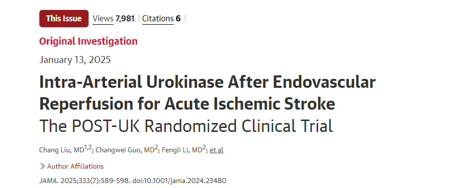 2025年1月13日,陆军军医大学第二附属医院杨清武教授领衔,在医学顶刊JAMA发表了一篇题为“Intra-Arterial Urokinase After Endovascular Reperfusion for Acute Ischemic Stroke:The POST-UK Randomized Clinical Trial”的研究论文。