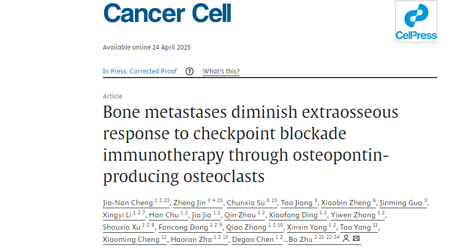 4 月 24 日,朱波教授团队在肿瘤领域权威期刊 Cancer Cell 杂志发表了题为“Bone metastases diminish extraosseous response to checkpoint blockade immunotherapy through osteopontin-producing osteoclasts” 的研究论文。