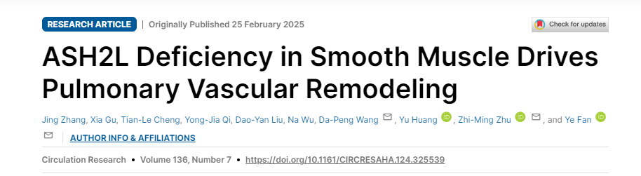 2月25日,陆军军医大学第二附属医院呼吸科范晔团队在Circulation Research 杂志发表了题为“ASH2L Deficiency in Smooth Muscle Drives Pulmonary Vascular Remodeling”的论文。