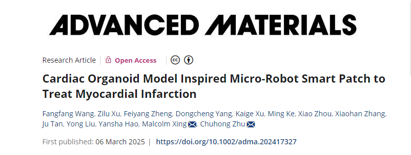 3月7日,陆军军医大学朱楚洪教授团队联合加拿大曼尼托巴大学Malcolm Xing团队在 Advanced Materials 发表了题为“Cardiac Organoid Model Inspired Micro-Robot Smart Patch to Treat Myocardial Infarction”的突破性研究成果。
