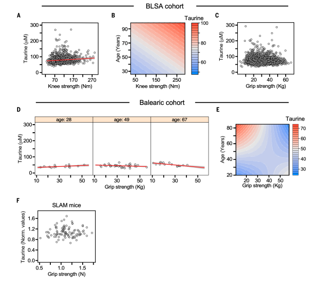 结果显示,在健康的人类、非人灵长类动物和小鼠中,牛磺酸的浓度并不会随着年龄的增加而下降,反而会上升或保持不变。