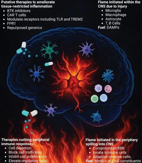 目前,针对神经炎症的治疗已取得一些进展。在多发性硬化症中,靶向外周免疫细胞的药物(如阻止免疫细胞进入中枢的那他珠单抗)能有效减少复发;但对于进展期疾病和其他神经系统疾病,需要能穿透血脑屏障的药物。