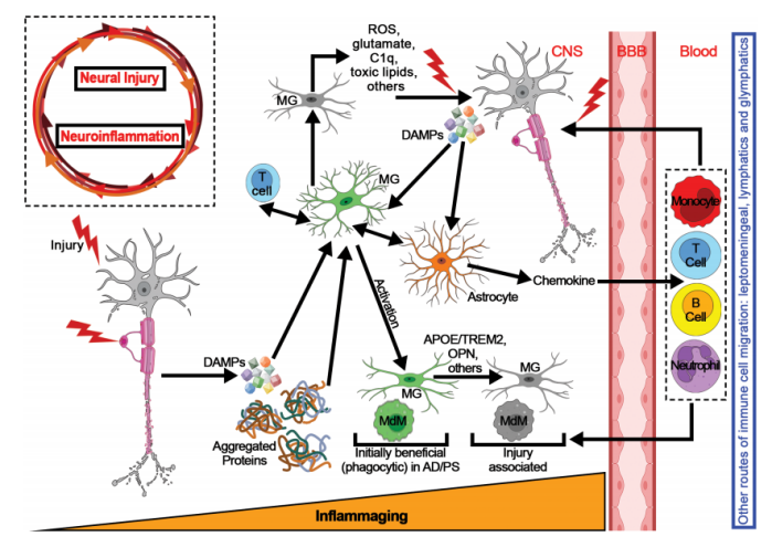 神经炎症,简单来说是中枢神经系统(CNS)应对损伤的一种免疫反应,主要表现为小胶质细胞和星形胶质细胞的激活,以及外周免疫细胞(如淋巴细胞、中性粒细胞)的浸润。