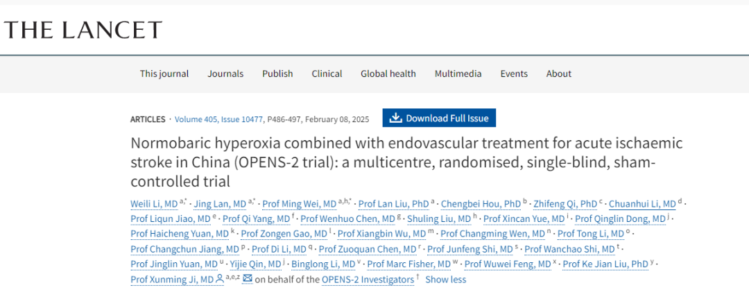 2025年2月7日,吉训明院士团队在医学顶级医学期刊《The Lancet 》发表了题为“Normobaric hyperoxia combined with endovascular treatment for acute ischaemic stroke in China (OPENS-2 trial): a multicentre,randomised, single-blind, sham-controlled trial”的研究论文,探讨了发病 6 小时内的前循环大血管闭塞性急性缺血性脑卒中患者接受常压高浓度氧联合血管内治疗对其 90 天功能预后的影响,并评估了该治疗方案的安全性。