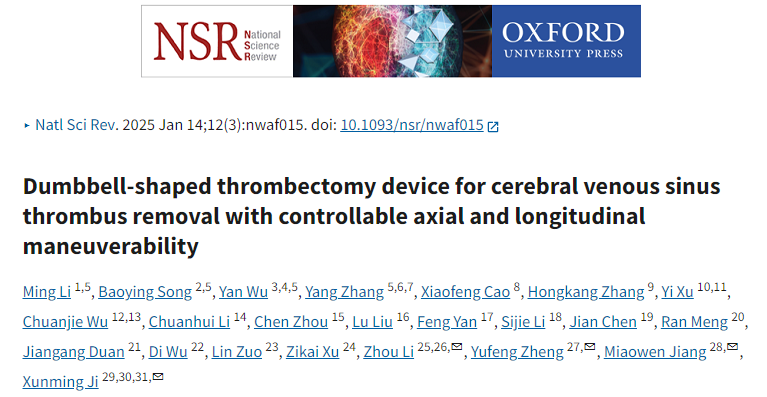 2025年2月14日,吉训明团队在National Science Review(IF=17)上发表题为“Dumbbell-shaped thrombectomy device for cerebral venous sinus thrombus removal with controllable axial and longitudinal maneuverability”的研究论文,开发了全球首个专用于脑静脉窦血栓的取栓装置“Venus-TD”。
