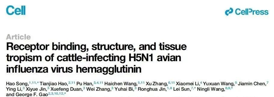 2025年1月22日,中国科学院微生物研究所高福院士联合北京同仁医院/北京市眼科研究所王宁利教授、北京地坛医院病理科孙磊主任及宋豪研究员为共同通讯作者在国际顶刊 Cell 在线发标题题为“Receptor Binding, Structure, and Tissue Tropism of Cattle-Infecting H5N1 Avian Influenza Virus Hemagglutinin”的研究论文。