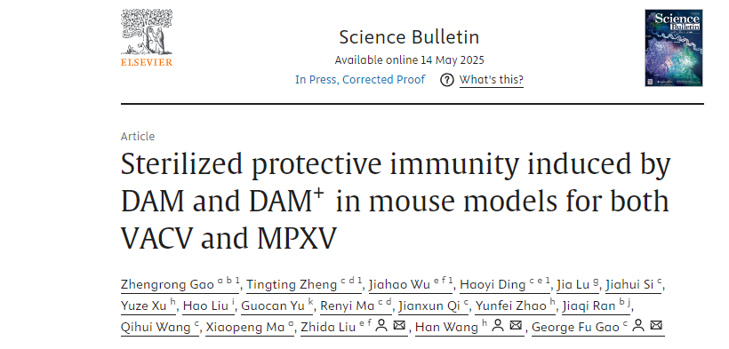 5 月 14 日,高福院士联合北京大学王寒副研究员、山西高等创新研究院刘志达研究员共同在 Science Bulletin (IF=21.1)上在线发表了题为“Sterilized protective immunity induced by DAM and DAM+ in mouse models for both VACV and MPXV”的研究性文章。