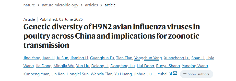 6 月 3 日,中国科学院微生物研究所毕玉海教授、高福院士联合上海交通大学病毒研究所的史卫峰教授作为共同通讯在 Nature Microbiology(IF=19.4) 上发表了题为“Genetic diversity of H9N2 avian influenza viruses in poultry across China and implications for zoonotic transmission”的研究论文,揭示了H9N2禽流感病毒的高度流行性、遗传多样性和抗原变异性。