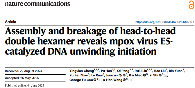 6月4日,中国科学院微生物研究所高福院士联合北京大学未来技术学院王寒副研究员和施一研究员作为共同通讯作者在 Nature Communications (IF=15.7) 上在线发表了题为“Assembly and breakage of head-to-head double hexamer reveals mpox virus E5-catalyzed DNA unwinding initiation”的研究论文。