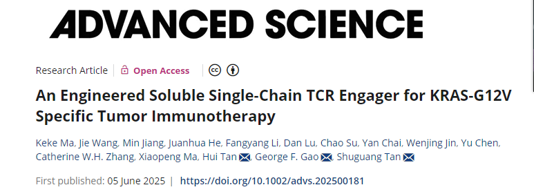 6 月 5 日,浙江大学医学院附属第二医院谭曙光研究员联合高福院士、深圳儿童医院谭回研究员共同在 Advanced Science (IF=14.1)发表了题为“An Engineered Soluble Single-Chain TCR Engager for KRAS-G12V Specific Tumor Immunotherapy”的研究论文,探索了基于 KRAS-G12V 特异性 1-2C TCR 的可溶性衔接子的工程化设计策略及其在靶向 HLA-A*11:01 背景下 KRAS-G12V 突变肿瘤中的治疗潜力。