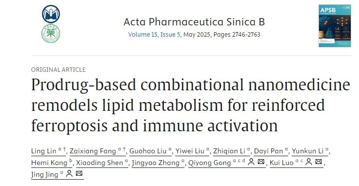 基于前药的联合纳米药物通过重塑脂质代谢增强铁死亡及免疫激活