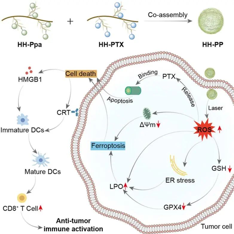 该研究聚焦于三阴性乳腺癌(TNBC)的治疗,基于铁死亡(一种脂质氧化驱动的程序性细胞死亡)的抗肿瘤潜力,开发了一种双模态纳米药物(HH-PP)。该药物通过肝素(HP)接枝聚(N-(2'- 羟基)丙基甲基丙烯酰胺)(pHPMA)形成载体(HH),分别负载紫杉醇(化疗药物)和焦脱镁叶绿酸 - a(光疗药物)后共组装而成。