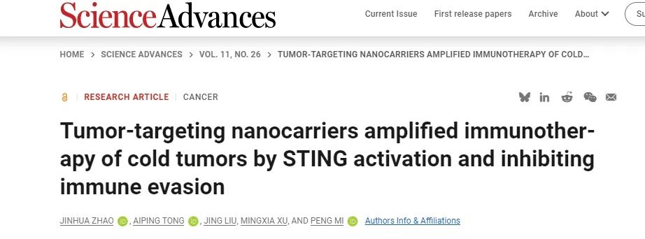 2025 年 6 月 27 日,四川大学华西医院米鹏教授作为独立通讯作者在国际期刊 Science Advances (IF=11.7)发表了题为“Tumor-targeting nanocarriers amplified immunotherapy of cold tumors by STING activation and inhibiting immune evasion”的研究论文,聚焦低免疫原性(“冷肿瘤”)和免疫逃逸导致肿瘤免疫治疗效果不佳的核心问题。