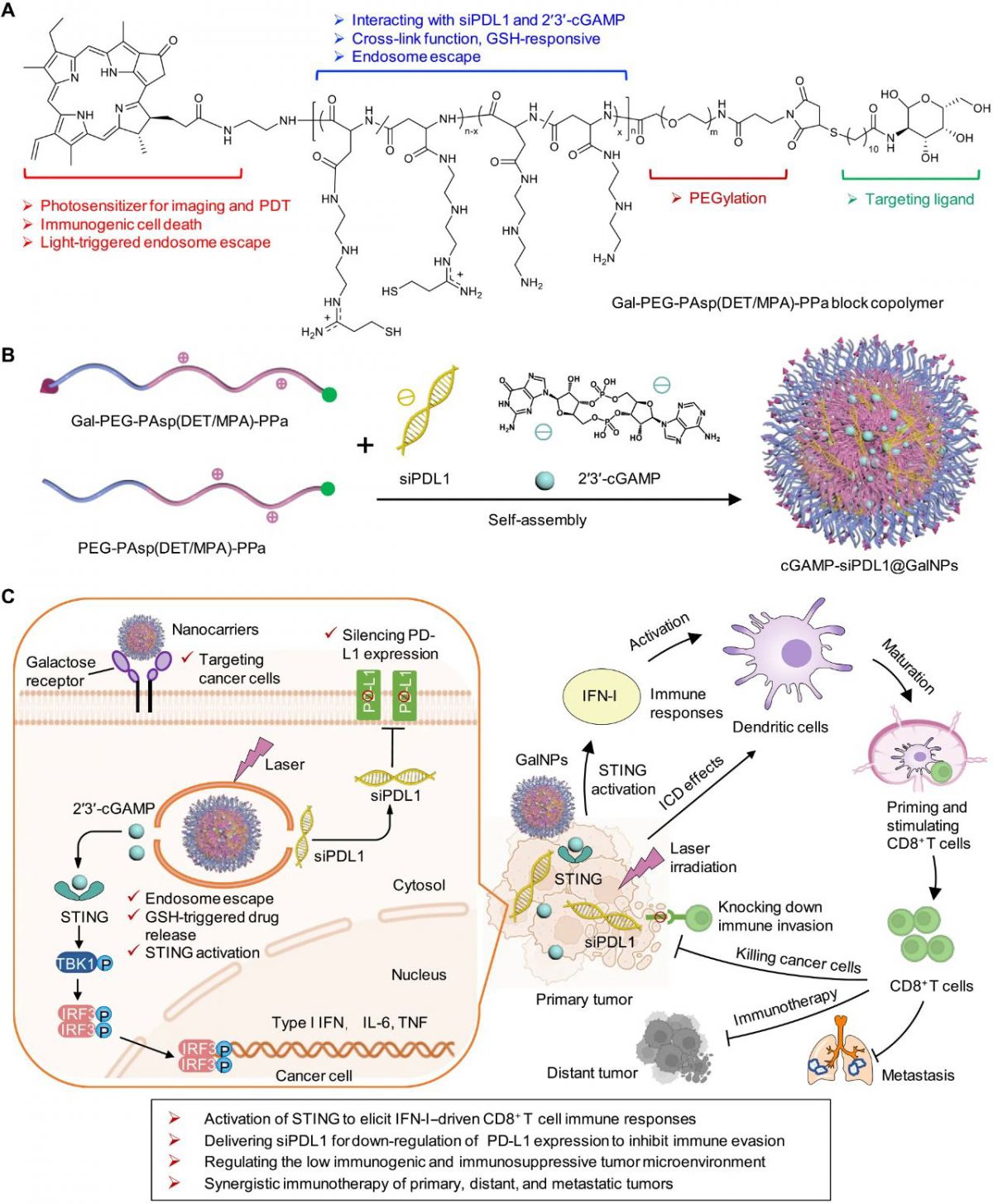 在此,研究人员合成了包含光敏剂、阳离子及硫醇衍生物的多功能聚合物,构建了一种装载半乳糖修饰的STING激动剂和程序性死亡配体 1(PD-L1)小干扰 RNA(siPDL1)的纳米载体(cGAMP-siPDL1@GalNPs),旨在通过激发强烈免疫应答,实现低免疫原性肿瘤的协同免疫治疗。